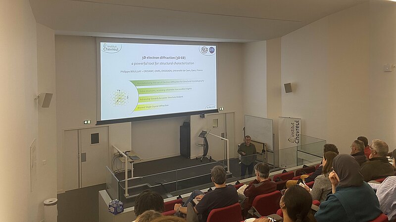 Philippe Boullay spécialiste de la question, était présent à l’Institut Chevreul pour réaliser un séminaire ce jeudi 15 mai à 14h30. Après une introduction à la méthode, dans laquelle Philippe Boullay a expliqué les différentes approches disponibles, il a illustré quelques applications de la 3D ED pour différents types d’échantillons et de problématiques. Pour commencer, la 3D ED assistée par précession, qui permet de résoudre des structures complexes et d’obtenir des affinements fiables et précis pour des composés « stables », typiquement en science des matériaux. Ensuite, la 3D ED en rotation continue, qui permet d’acquérir des données avec des temps de collecte inférieurs à la minute pour des composés « fragiles », typiquement certains matériaux poreux, en pharmacologie et en sciences de la vie. Pour finir, Philippe Boullay a présenté quelques développements instrumentaux et méthodologiques récents destinés à rendre cet outil encore plus accessible, polyvalent et efficace.